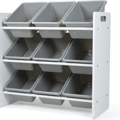 Humble Crew Explorer Wooden Toy Storage Organiser for Children, with 9 BPA Free Plastic Removeable Storage Bins, Ideal for Storing Toys, Games, Books and Craft Supplies – White/Grey
