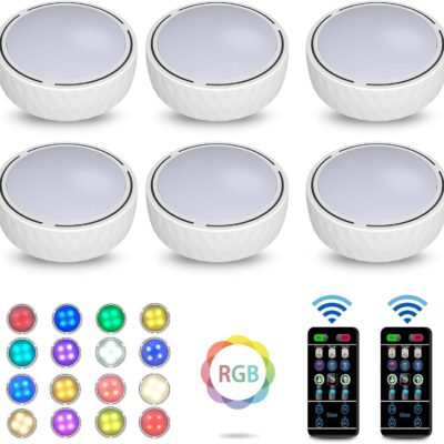 Bawoo Under Cabinet Lights, RGBW Wireless LED Puck Lights Remote Control,3500/4500/6000K Dimmable Battery Powered Atmosphere Night Light for Kitchen Wardrobe Cupboard Color Changing,6 Pack (White)