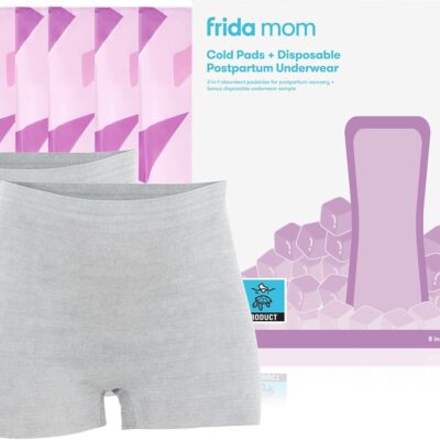 Frida Mom 2-in-1 Postpartum Pads + Disposable Knickers, Soothing Instant Cold Therapy Pack and Absorbent Maternity Pad in One + Ultra-Soft and Stretchy Boyshort Cut, Size Regular, 8 Pads + 2 Knickers