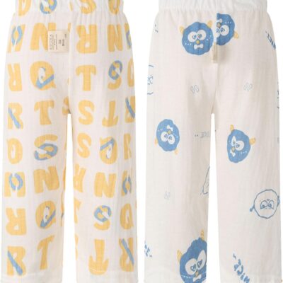 inlzdz 2 Pack Girls Cotton Linen Wide Leg Trousers Baby Kids Elastic Waist Colorful Print Pants Bloomers