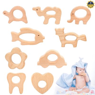 9 PCS Wooden Baby Teether Wooden Teething Ring Natural Wooden Animal Teethers Toys Montessori Style Pain Relief Teething Wooden Teether for Baby DIY Pendant Decorations (9 Shapes)