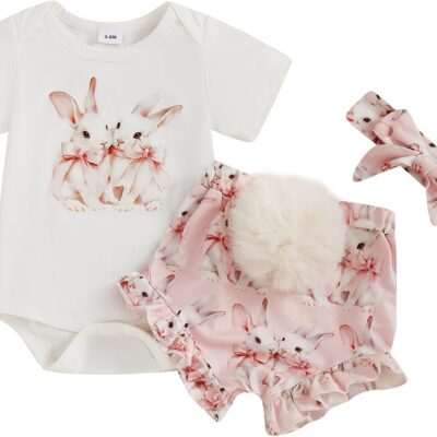 Dubute My First Easter Outfit Baby Girl Bunny Romper Bodysuit +Pompom Shorts Bloomer 1st Easter Clothes 3PCS