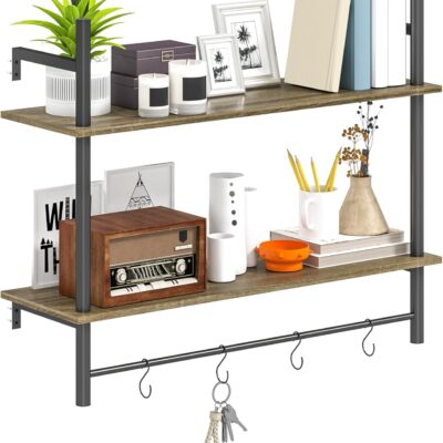 HOMCOM Floating Shelves, 80CM Wall Mounted Shelf with 4 Hooks, Rustic Wood Display Shelf for Living Room, Entryway, Bedroom, Grey