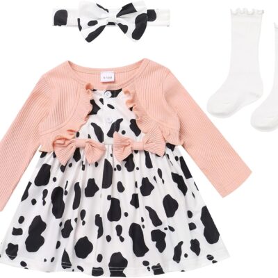 OMEWEE Baby Girl 1st Birthday Outfit Long Sleeve Romper Dress Floral/Cow/Candy Print Dress with Headband Socks 3PCS Spring Clothes Cake Smash Party Photograph