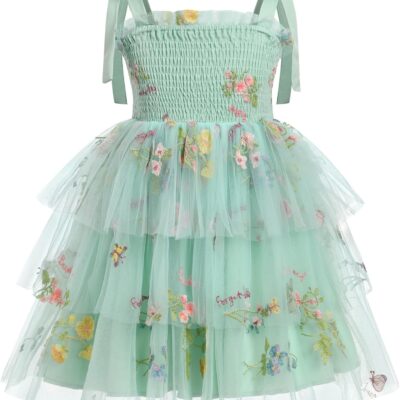FYMNSI Flower Girl Dress Kids Summer Spaghetti Strap Tie Shoulder Smocked Tiered Tutu Tulle Princess Dress for Birthday Party Wedding Special Occasion