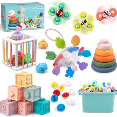 Plunack 6 in 1 Montessori Toys for Babies- Stacking Rings Blocks, Shape Sorter, Matching Eggs, Suction Cup Toy, Baby Sensory Toys Gifts (6 IN 1 Baby Toy)
