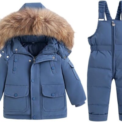 Valcatch Toddlers Boys Girls Snowsuit Hooded Faux Fur Down Jacket Puffer Overall Trousers Sets Kids Baby Solid Winter Warm Coat Bib Pants Dungarees Cold Weather Outfits Ski Suit Age for 1-5 Years