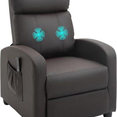 HOMCOM Recliner Armchair, Massage Faux Leather Push Back Reclining Chair with Adjustable Leg Rest, Side Pocket, for Home Living Room Theatre, Brown