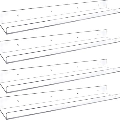 Febwind 4 Pack 24-Inch Long Clear Acrylic Floating Shelves Wall Ledge Invisible Wall Mounted Floating Bookshelf U Shape Wall Shelf for Book Display Makeup Product Spice Organizer
