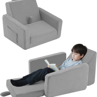MeMoreCool Kids Sofa, Folding Toddler Chair, Comfy Plush Fold Out Toddler Couch, Convertible Kid Play Sofa Bed, Flip Out Baby Armchair Recliner for Toddlers 1-3 Girls Boys, Grey