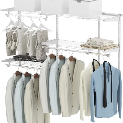 COSTWAY Closet Organiser System, Wall-Mounted Adjustable Metal Rail Garment Rack, Space Saving Clothes Storage Unit for Wardrobe and Bedroom (3 Hanging Rods + 4 Storage Shelves, White)