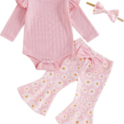 Siyova Newborn Baby Girl 3 Piece Outfits Long Sleeve Ribbed Romper+Daisy Flare Pants+Bow Headband Toddler Girl Fall Clothes Sets