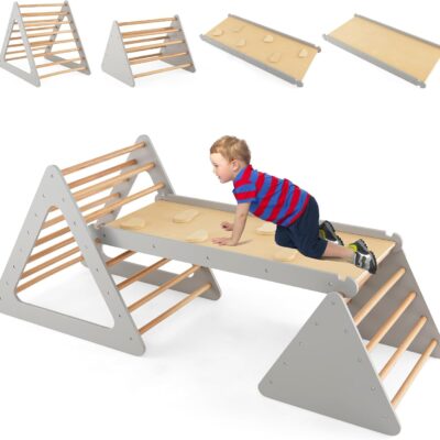 GYMAX 3 in 1 Kids Climbing Set, Wooden Toddler Climber with Reversible Ramp, Outdoor Indoor Children Climbing Frame for 3 Years Old + Boys Girls (Natural+Grey)