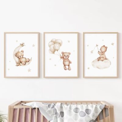 Bear Nursery Wall Art Decor Set of 3 Teddy Bear Canvas Wall Art Baby Boy Nursery Prints Nursery Pictures Wall Decor Moon Star Cloud Neutral Nursery Print for Girls Children Room 12×16 Inch Unframed