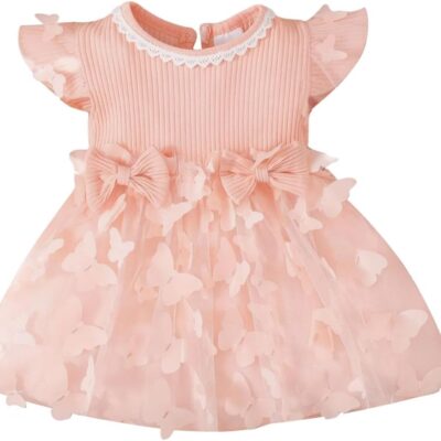 JiAmy Baby Girl Dress Butterfly Embroidery Mesh Tulle Dresses Toddler Ruffle Short Sleeve Skirt Patchwork Bowknot Spring Summer Baby Girl Clothes for 6 Months-3 Years