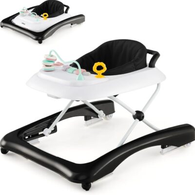 Maxmass 2-in-1 Baby Walker, Foldable Infant Activity Center with 3 Adjustable Heights, Wheels, Padded Seat and Removable Double Tray, Toddler Push Along Walker for 6-14 Months (Black)
