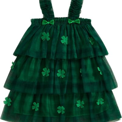 Kid Toddler Baby Girl St Patricks Day Outfit Irish Clothes Clover Dress Sleeveless Green Layered Tulle Dresses