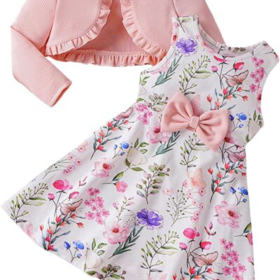 JiAmy Girls Dress and Cardigan Set Toddler Long Sleeve Knitted Coat Sleeveless Floral Print Dresses with Bow 2 Piece Outfits Clothes for Girl 12 Months-7 Years