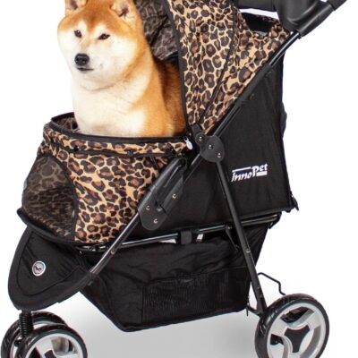 InnoPet Buggy Allure Cheetah – Stylish Leopard Print Dog Stroller with One-Hand Folding, Non-Puncture Wheels, Max 20kg, Storage Basket, and 2 Safety Tethers – Ideal Pet Pram for Cats and Dogs
