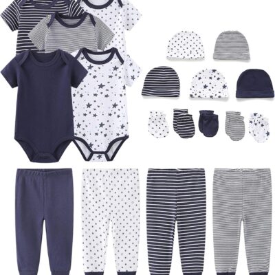 Baby Outfits Vests + Pants + Caps Mittens for Newborn Boys and Girls 0-6Months Grey Pink Navy Blue and Blue Cotton