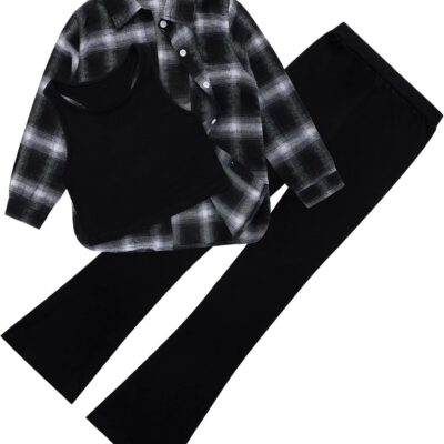 Naiyafly Girls 3 Piece Outfits Kids Cami Top + Flare Pants Set with Plaid Shirt Set Youth Girls Long Jacket Tanks Top Flare Leggings Bell Bottom Clothes