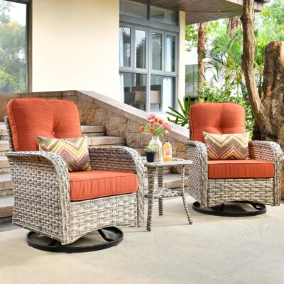 ovios Outdoor Swivel Rocking Chair Set of 3 with Coffee Table, Patio Wicker Rocker with Comfortable Thicken Deep Seating, Comfy Rattan Glider Chairs for Porch Deck Balcony Garden Backyard (Orange)