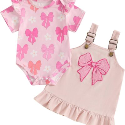 Haomibacu Infant Girls Embroidery 2 Pieces Outfits Short Sleeves Snack Print Romper Top Suspender Skirts Set Spring Casual Overall Dress Clothes Set