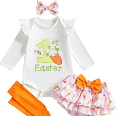 HodJIU My First Easter Baby Girl Clothes 4pcs Outfit Long Sleeve Bunny Romper Ruffle Bloomer Short Socks Bow Headbands Set Newborn Baby Clothing