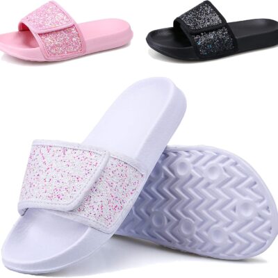 ydscsci Girls Slide Sandals Glitter Sequins Pool Sliders Kids Shower Slippers Beach Flip Flops Hook and Loop Non-slip Thick sole Little Kid