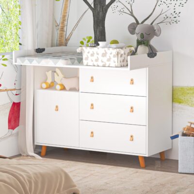 PREMTURE White Chest of Drawers, Baby Changing Table Cabinet with 4 Drawers & Storage Shelves, 114.4W x 46D x 117.5H cm Bedside Storage Cabinet Unit Dresser for Bedroom, Baby Room