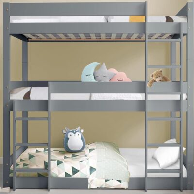 Triple Bunk Bed, 3ft Wooden Bunk Beds With Ladder – Triple Sleeper Kids Bunk Bed, Solid Pine Wood Single Bed Frame For Kids Children Home (Grey, L197 x W96 x H198 cm)