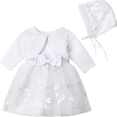 Newborn Baby Girl Christening Dress Long Sleeve Tulle Lace Dress Skirts Cardigan Coat Hat 3Pcs Infant Clothes Sets